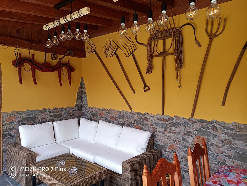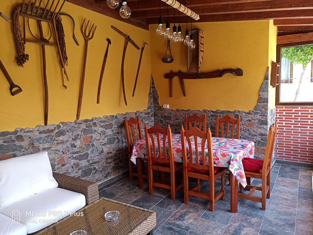Uno de los espacios más apreciados de nuestra casa es nuestro porche, amplio y funcional, que consta de una serie de sofás de jardín tipo chill out, con mesa de centro, mesa de comedor con sillas suficientes y una esmerada decoración rústica.