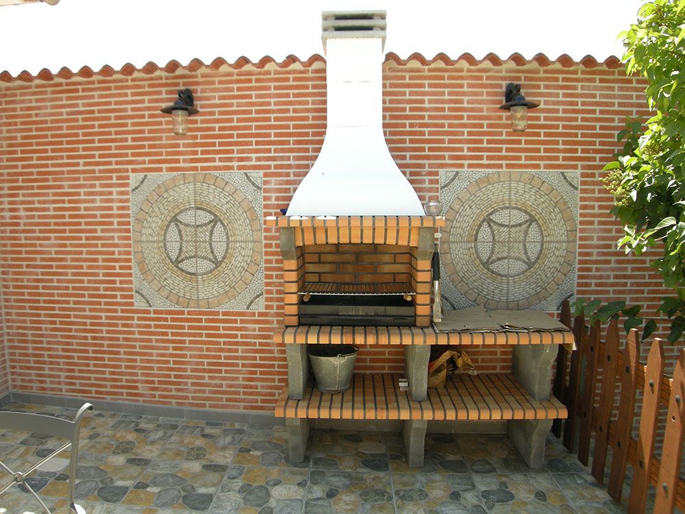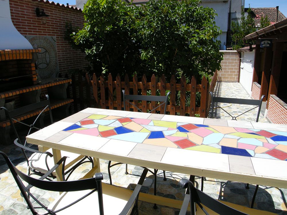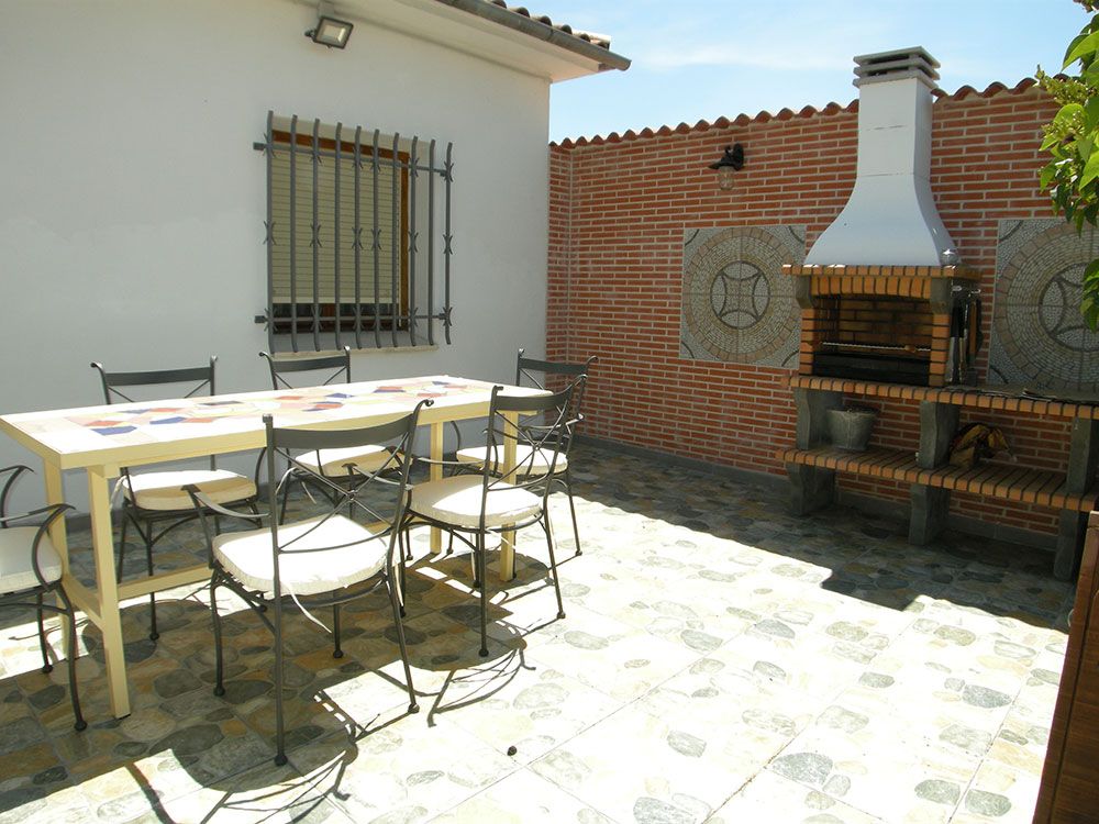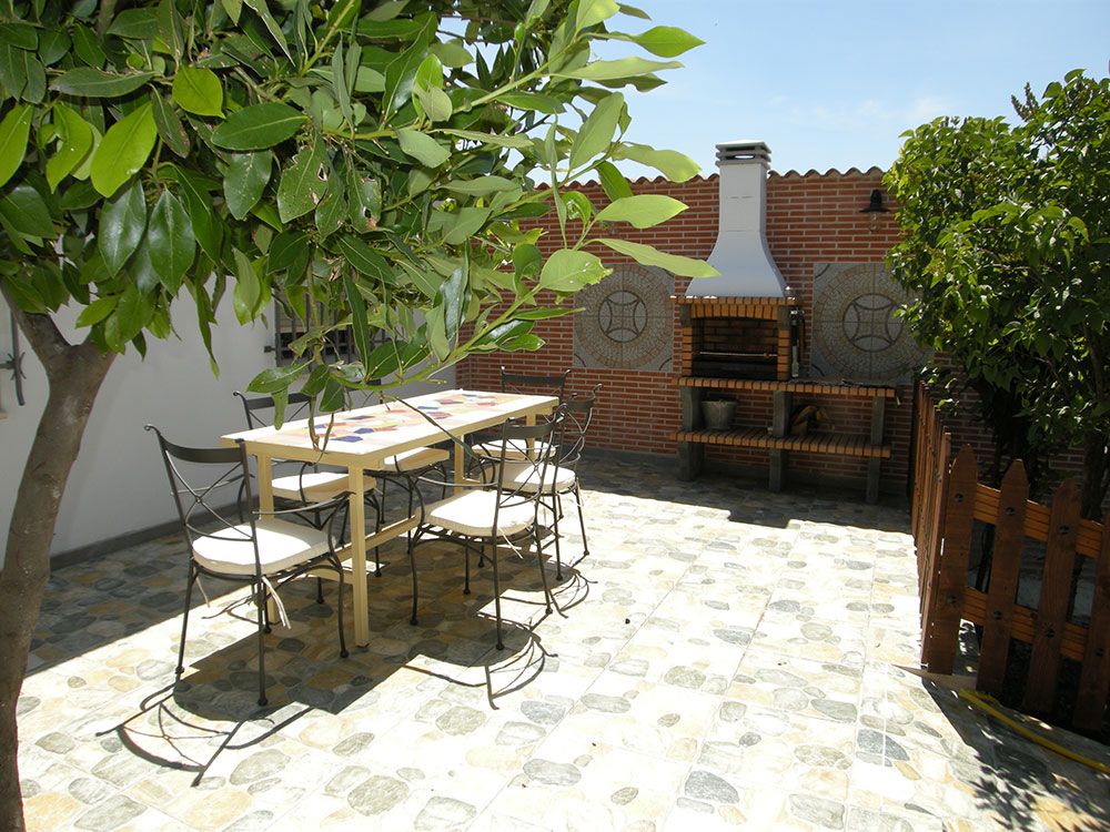 Al salir a nuestro patio nos encontramos con una amplia terraza solárium donde se ha instalado la barbacoa y una larga mesa con sillas para poder cenar al aire libre. Con una adecuada iluminación que se ubica junto al Laurel que da nombre a nuestra casa.